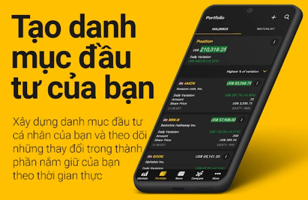 Bắt đầu hành trình tài chính của bạn hoặc nâng tầm chiến lược đầu tư với InvestApp – ứng dụng được thiết kế để trao quyền cho mọi nhà đầu tư. Dù bạn mới làm quen với thị trường hay đã có kinh nghiệm dày dặn, InvestApp mang đến một nền tảng toàn diện để theo dõi và phân tích các khoản đầu tư của mình. Dễ dàng xây dựng danh mục đầu tư cá nhân hóa, thêm các cổ phiếu và tài sản nắm giữ yêu thích để giám sát hiệu suất theo thời gian thực. Tạo danh sách theo dõi tùy chỉnh để không bỏ lỡ bất kỳ cơ hội nào từ hàng loạt công cụ tài chính toàn cầu.